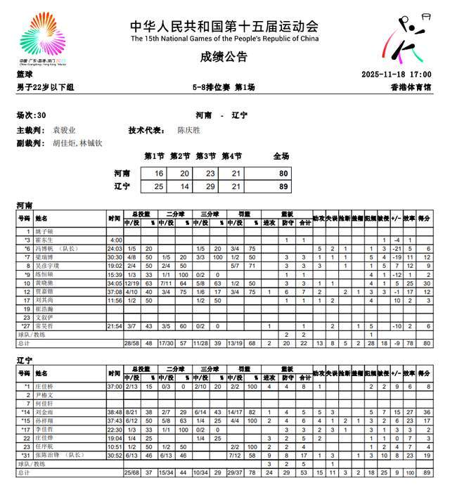 辽宁队只有7人轮转,3人得分上双,刘金雨21投8中,拿到36分5篮板5助攻,并拼到5犯离场。张陈治锋下半场发力,13投6中,12罚7中,拿到19分17篮板,孙祥翔12投6中,拿到17分6篮板4助攻。河南队黄晓驰30分。