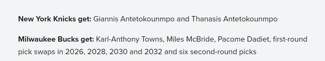 雄鹿得到:唐斯+麦克布莱德+达迪特+26年、28年、30年和32年首轮互换+6个二轮签。