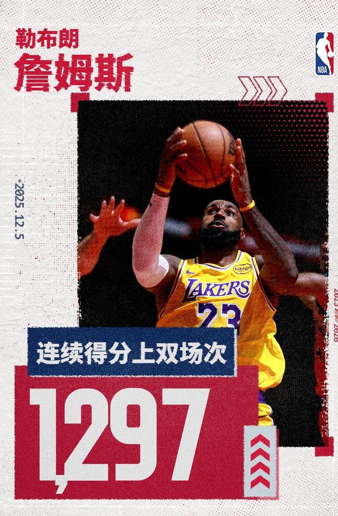 北青网(詹姆斯连续1297场得分上双纪录终结 上次距今已隔6908天2025.12.05)