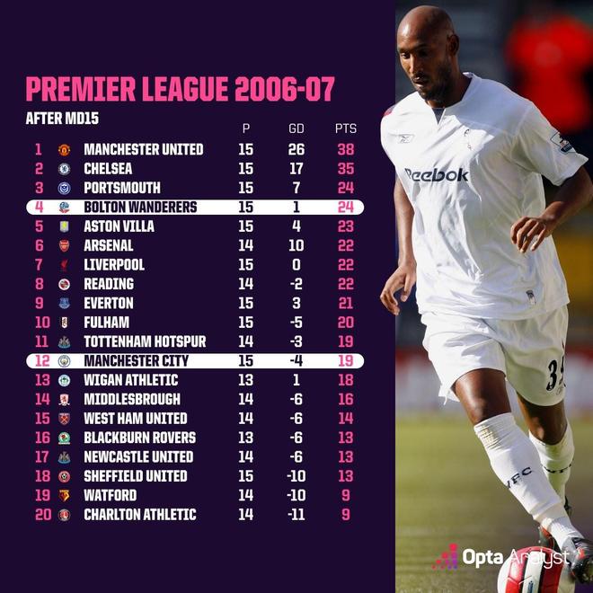 根据Opta的统计,英超上一次在前15轮过后排名第4和排名第12的球队之间分差不超过5分发生在2006-07赛季,当时博尔顿以24分排名第4,随后是维拉(23分)、阿森纳(22分)、利物浦(22分)、雷丁(22分)、埃弗顿(21分)、富勒姆(20分)、热刺(19分)以及曼城(19分)。