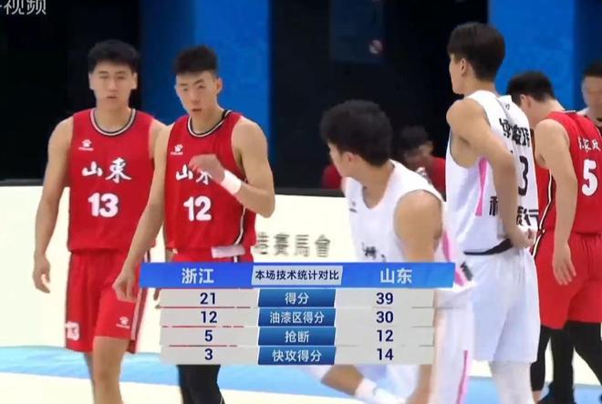 全运会U22男篮八进四的比赛,山东队对阵浙江队。山东队是夺冠热门,小组赛四战全胜。浙江队在小组赛的表现也非常不错,两胜一负排名小组第二。不过无论是从阵容还是实力上,两队的差距还是非常明显的。山东队全场掌控着局面,逐渐取得了20分以上的巨大领先。虽然浙江队末节比赛打出内线优势缩小了分差,却无力回天,山东队最终力克对手晋级四强。球员表现方面,景天雨12分3助攻,章海波7分,周怡衫11分5篮板,刘双语16分10篮板;山东队方面,陈家政13分5篮板3抢断,段昂君21分5篮板5助攻5抢断,崔新泉11分3篮板3抢断,曲笑宇19分12篮板4抢断。