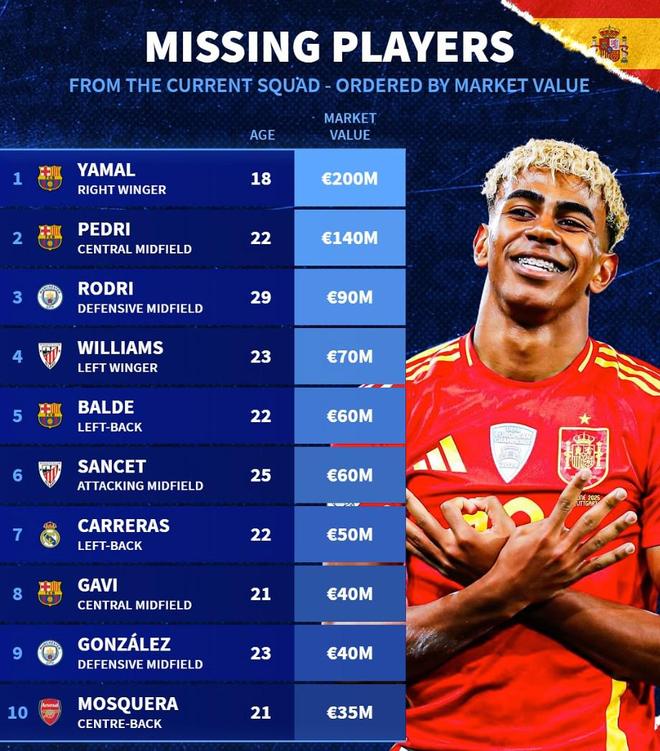 此次未入选西班牙队身价前10:亚马尔、佩德里、罗德里领衔